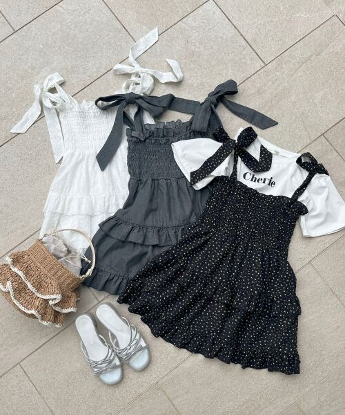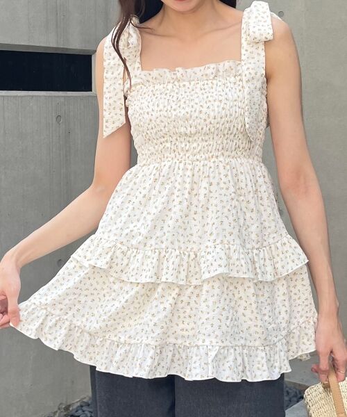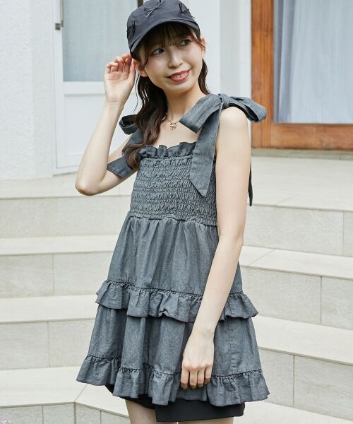 肩のリボンにときめくティアードデザインのガーリービスチェ
