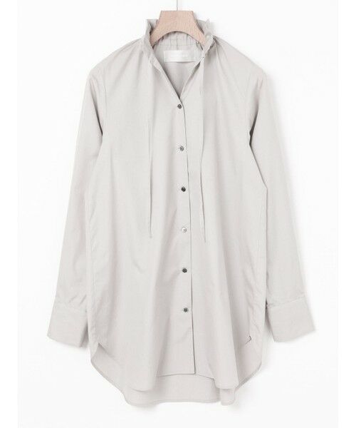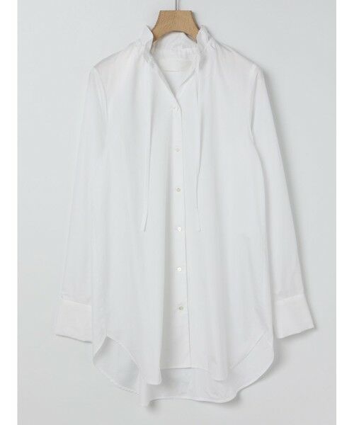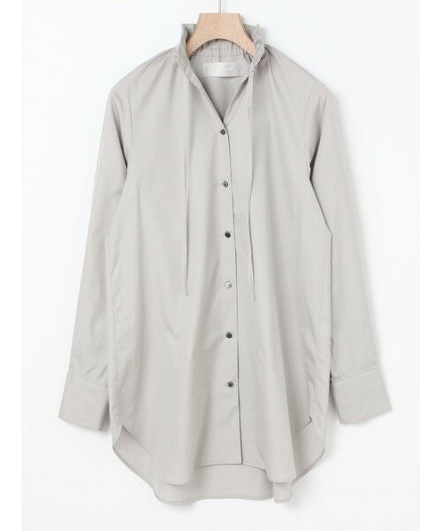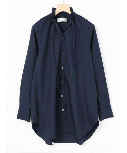 共紐を通した襟元の仕様がポイントのスピンドルギャザーネックシャツチュニックです。コンパクト気味なサイズ感とタテ長ラインのロングシャツでシャツ襟を立てたような襟元のディティールが特徴。ギャザーを寄せても甘くなりすぎず、大人っぽく着こなせるアイテムです。季節が進んだ際のレイヤードインナーにも活躍。襟の共紐は垂らしても結んでも着用できる長さで設定。様々なアレンジがきく為その日のコーディネートで襟元のオシャレを楽しんでいただけます。ケバ感を抑えたクリアな表面感とナチュラルな光沢感のある上品でなめらかな綿100%:100/2ブロードの無地と秋らしいタータンチェック(3-830012A)のカラー展開。