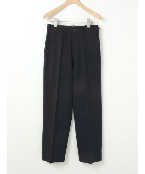 デザイン的には表からの見た目はあまり変えず、裏側の隠しポケットやサスペンダー用のループ・釦などのディティールをそぎ落としてシンプルに。ウエスト調整ができるよう、ベルトに付いたアジャスター機能はそのまま残しています。ベーシックなシルエットで、合わせるアイテムを選ばないアイテム。生地はウール見えするpolyester100%のトロ素材を使用。