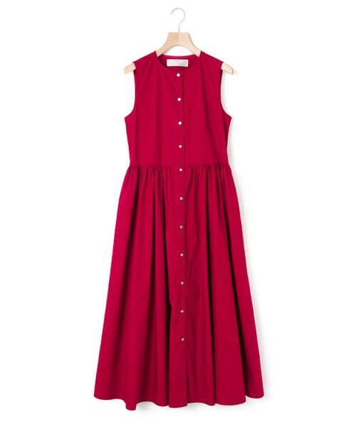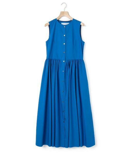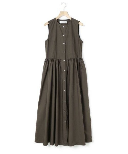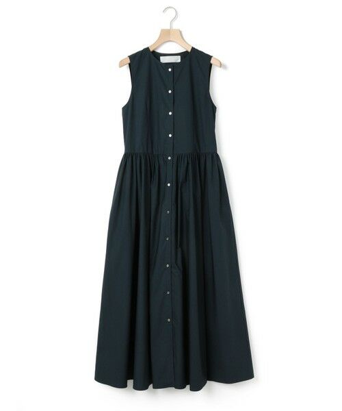 コンパクトめな身頃とボリューム感のあるスカート部分のメリハリが女性らしいノースリーブボリュームワンピース。1枚で様になるワンピースです。シルエットの雰囲気に合わせてアームホールや衿ぐり裏には古着っぽさのあるサテン素材を使用。ちら見えした時のさり気ないポイントになったデザインが特徴。前を開けてジレ風の羽織として着用可能。綿100%でハリ感のあるタイプライター素材を使用。上品で清楚な着こなしを演出できるワンピースです。