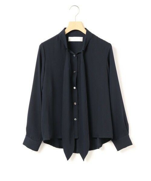 24春夏で展開した1-830028 /シャツカラーリボンシャツを秋冬使用に差材を替えてデザインしたリボンクラシックシャツです。素材感に合わせサイズを少し削りアレンジしました。前回のシャツ生地とは違った雰囲気で光沢がある合繊素材のため女性らしくキレイ目な雰囲気に仕上がっています。ネクタイを襟に通したときのように襟から繋がるリボン状のボウタイは結ばないときは下ろしたままで恰好良く。リボンで結んだときはボリューム感がアクセントになる印象の違いがポイントです。きちんと感のある着こなしにも、デニム合わせなどのカジュアルなスタイリングにもお勧めです。