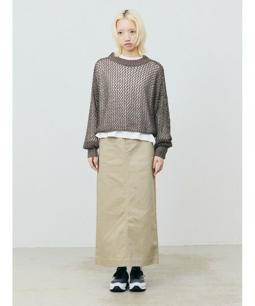 テープヤーン(意匠糸)を使用したテープヤーンメッシュプルオーバーです。ざっくりとしたメッシュ編みにすることで、清涼感があり1枚で存在感があるニットを表現しました。やや着丈を短く設定しており、シャツなどに重ねたときにもバランスが良く、またボトム合わせとのバランスが取りやすくなっています。袖は長めでザックリとした印象。柔らかくて軽さのあるニット地で着心地の良さも体感していただける1枚です。同シリーズ3-820046/テープヤーンメッシュベストも展開。