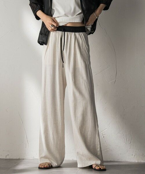 異素材の配色ベルトがスタイリングを引き締めてくれる、リネン・ワイドパンツ。