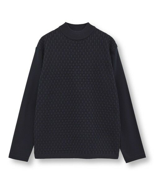 前身頃にポリエステル糸で編み上げた凹凸のある格子柄ニット、袖と後ろ身頃にはシルケット加工を施したなめらかなスムース素材を採用。