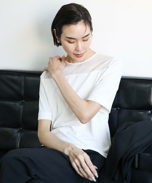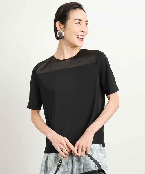 胸上をシアーな素材で切り替えたジャージー素材のブラウソーです。ジャケットのインナーとしても、1枚着としても衿元をクールに演出してくれるアイテムです。