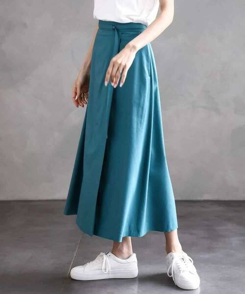 すっきりとした腰まわりとナチュラルに広がるAラインシルエット。自然に巻きスカート風に見え、ベルト部分にワンテクニックを施してアクセントに。ステッチを効かせた同素材のベルト付きで、ウエストサイズの調整が効く点もポイントです。40サイズは限定店舗展開です。