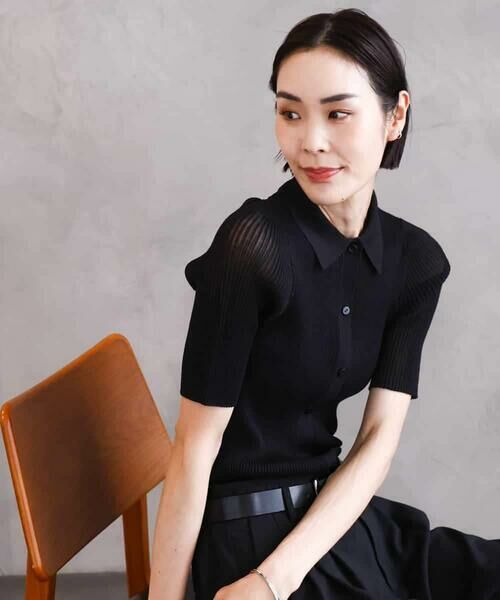 シアーな素材をリブ編みした襟付きのポロニット。適度なハリ感の肉厚感。程よいフィット感ですっきり見えを叶えます。透け過ぎず着やすいニットです。40サイズは限定店舗展開です。