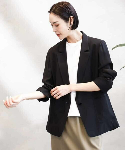 きちんとした印象のジャケットは、無造作に袖をタックアップして抜け感を演出するのがおすすめ。カーディガン感覚で羽織れてインナー・ボトムスを選ばない一枚です。