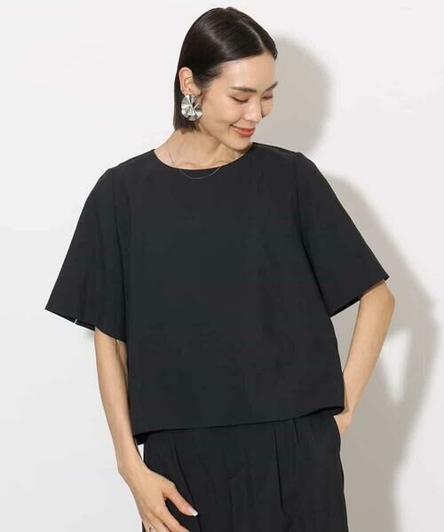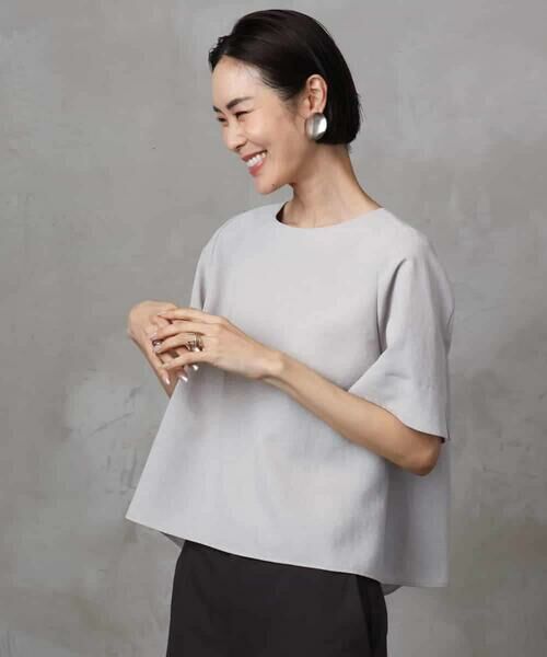 ドライタッチな素材をシンプルなデザインで仕立てて、少し改まったシーンでも着やすい一枚着ブラウスに。後ろ中心に身頃と同色のボタンを配してアクセントに。開きすぎない襟ぐり設定になっています。袖後ろ部分にはスリットあきをいれてさりげなく抜け感を感じるアクセントにしました。40サイズは限定店舗展開です。