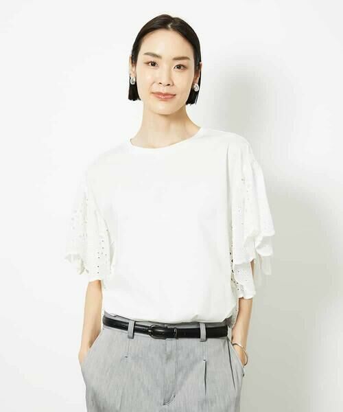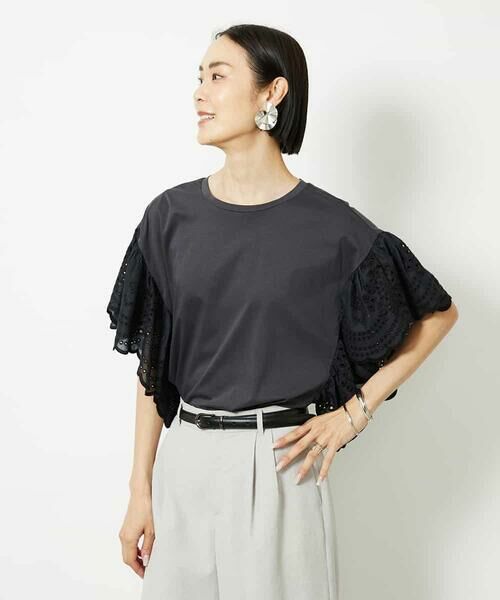 肩先で布帛のボーラーレースを挟み込むことで、隠したいところは隠しつつも、華やかに魅せてくれるレディーライクで上品なカットソーです。