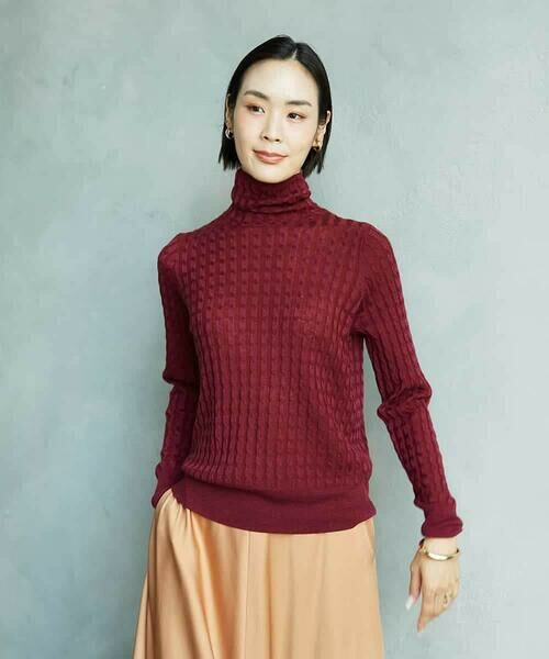ほどよいシアー感とラメのきらめきが上品なハイネックニット。立体的なケーブル柄が華やかさを演出し、すっきりとしたシルエットで洗練された印象に仕上がります。一枚での着こなしはもちろん、ニットベストやジャケットのインナーとしても最適。秋冬のレイヤードスタイルに映える万能アイテムです。
