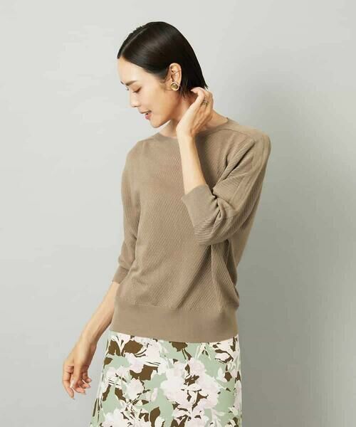 斜めの編み柄がさりげなく表情を添えるニットは、シンプルながら一枚で着映えするデザイン。スカートにもパンツにも合わせやすく、ボトムスを選ばず活躍します。