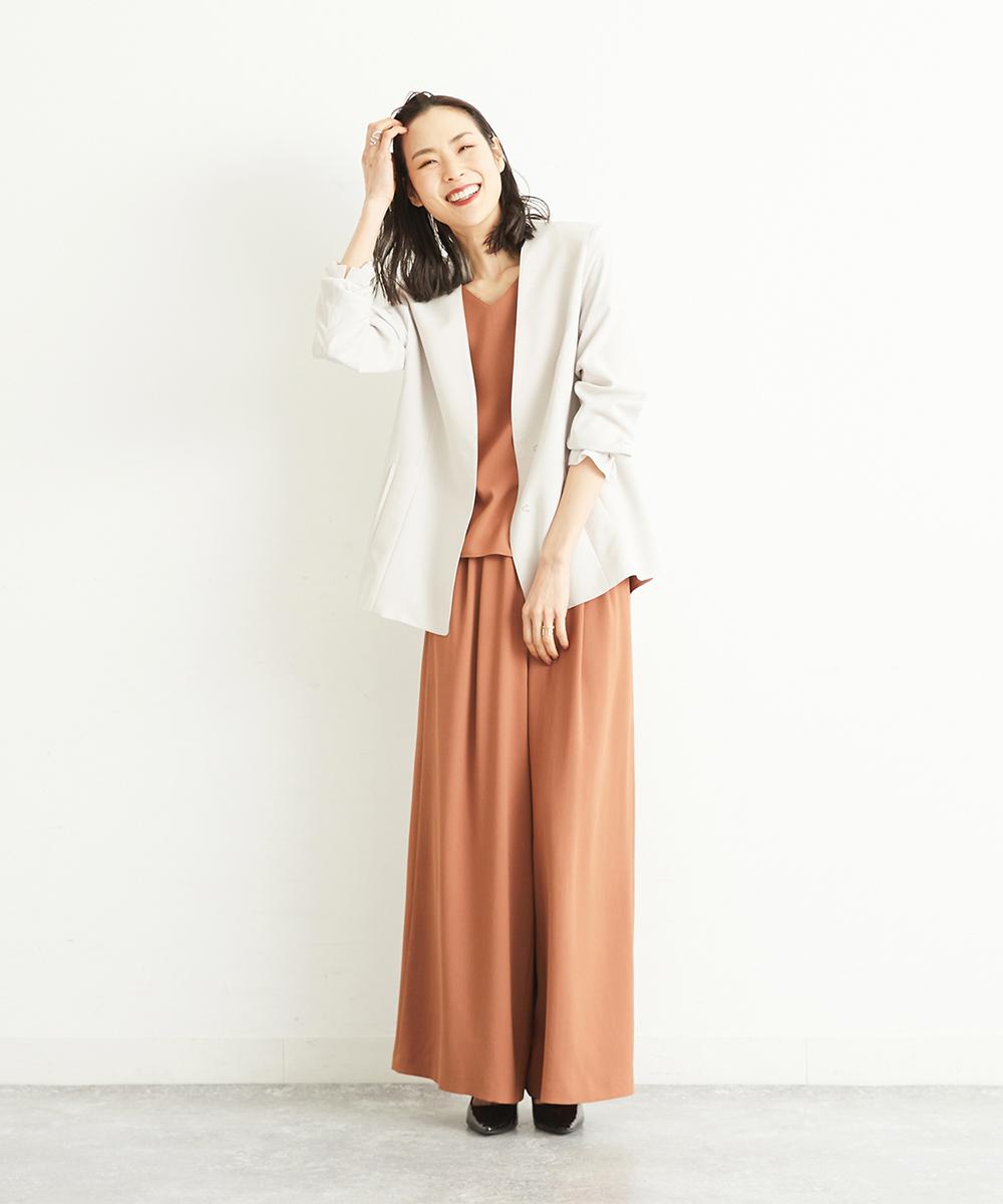 深めのVのノーカラーがお顔まわりをスッキリ見せてくれます。