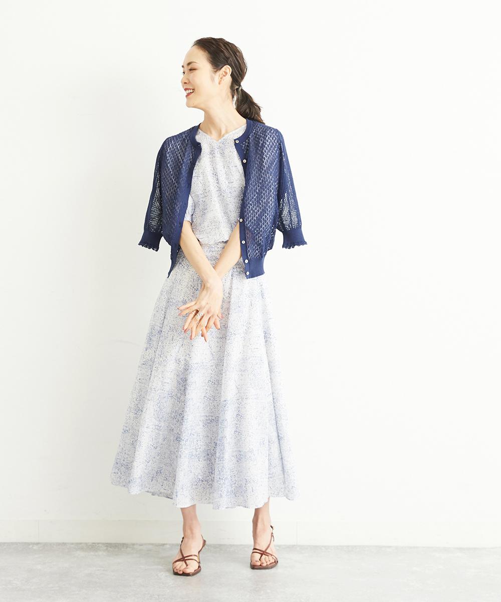 コンパクトなシルエットにパフスリーブがかわいらしい、透かし編のカーディガンです。袖と身頃と、2種類の柄を組み合わせているところもポイント。袖口もフリルのようなデザインでアクセントに。40サイズは限定店舗展開です。