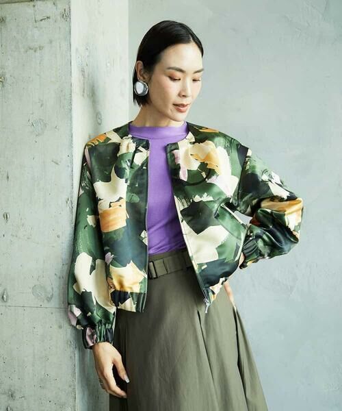 オリジナルプリント素材で仕立てたノーカラーショートブルゾン。素材のハリ感を活かした立体的なフォルムが特徴で、ハードになりすぎず洗練された華やかな印象に仕上げています。40サイズは限定店舗展開です。