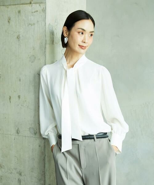 ストレッチジョーゼットで仕立てたシアーボウタイブラウス。ノーカラージャケットのインナーとしても映えるすっきりとしたシルエットに、顔まわりを華やかに引き立てるボウタイのデザインを添えました。オフィススタイルに、洗練された印象をプラスする一枚です。40サイズは限定店舗展開です。