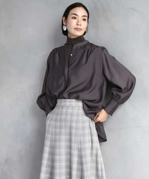 程よい透け感のある軽やかな素材で、ボトムスを選ばず幅広くコーディネートできます。スカートやパンツに合わせて、シーンに応じた上品な着こなしが楽しめます。軽やかで適度なハリ感がボディラインを拾わず、美しいシルエットをキープ。インナーにハイネックカットソー[FMKAD19130]を重ねたレイヤードスタイルがおすすめです。同デザインのチェック柄[FMBAD09260]もご用意いたしております。