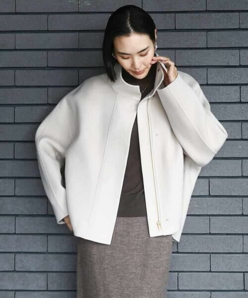 ポンチョ型のオフボディシルエットが特徴のコート。ジップを上まで上げてもメイクが付きにくいよう設計された襟元など、細部にまでこだわったパターンがポイントです。リラクシーな着心地ながら立体的なフォルムで、華奢に見えるシルエットに仕上げています。
