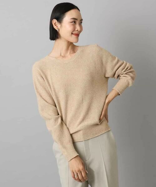カシミヤとアンゴラをブレンドした、ふんわりと軽やかな素材感が魅力のニット。風合いの良さを活かし、カノコ編みで丁寧に仕上げることでクラフト感をプラスしました。繊細なラメ糸がほのかに煌めき、カジュアルながらも上品な表情を演出します。