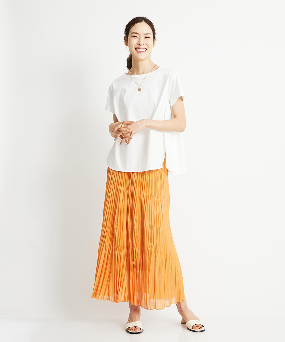 着ぶくれてみえにくいこだわりのAラインカットソー。ボリュームのあるスカートから細身のパンツまで、ボトムスを選ばない万能アイテムです。同素材ドルマンスリーブカットソー【FMKGM45150】もご用意いたしております。