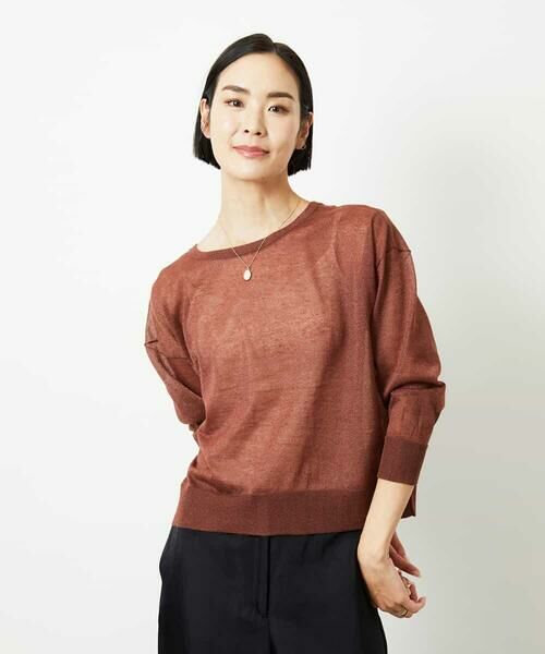 レーヨンとポリエステルをブレンドした薄手のニット素材を使用。ほどよい光沢感とシアーな透け感が生み出す、上品で抜け感のある表情が魅力です。軽やかな風合いで肌触りもよく、季節の変わり目にも快適に着用いただけます。レイヤードスタイルにも最適な一枚です。