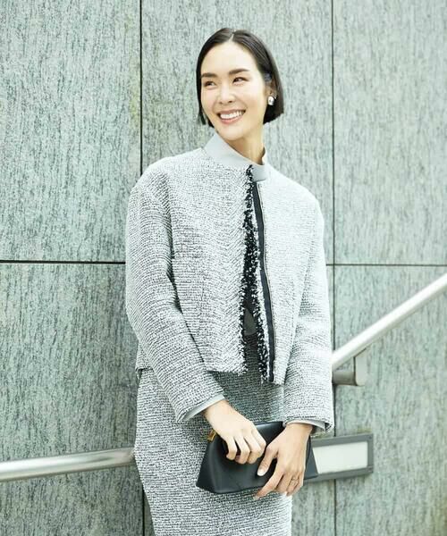 同素材のスカートと合わせたセットアップスタイルがおすすめです。ワンピースの上に羽織ればフォーマルシーンにぴったり。デニムなどと合わせて、きれいめカジュアルに着こなすのも◎。オン・オフ兼用で幅広く着まわせます。