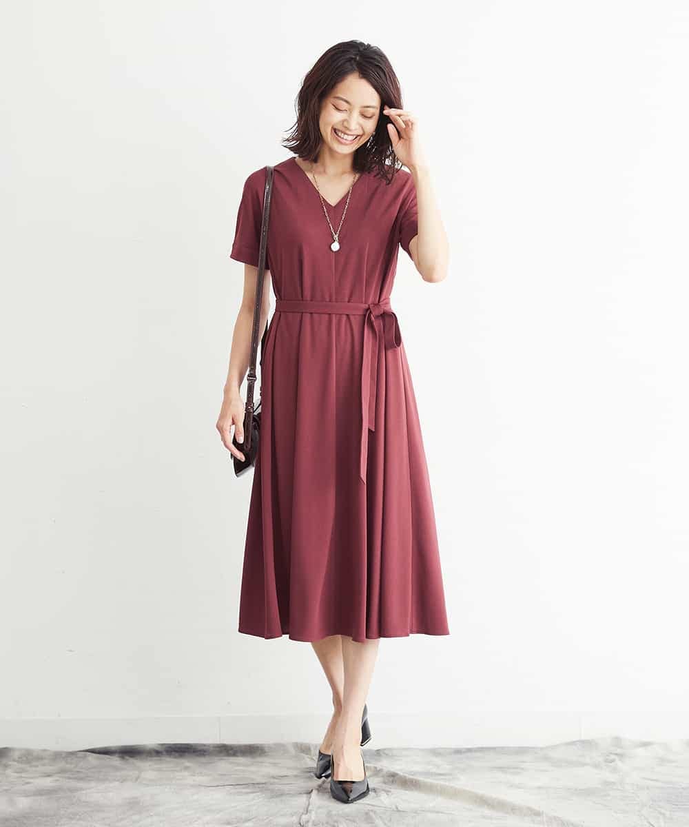 二の腕が隠れる半袖より少し長めの袖丈が、羽織を脱いだ時も安心です。伸縮性のある素材なのでお仕事着でも、普段着でも汎用性が高いワンピースです。(大丸梅田店)