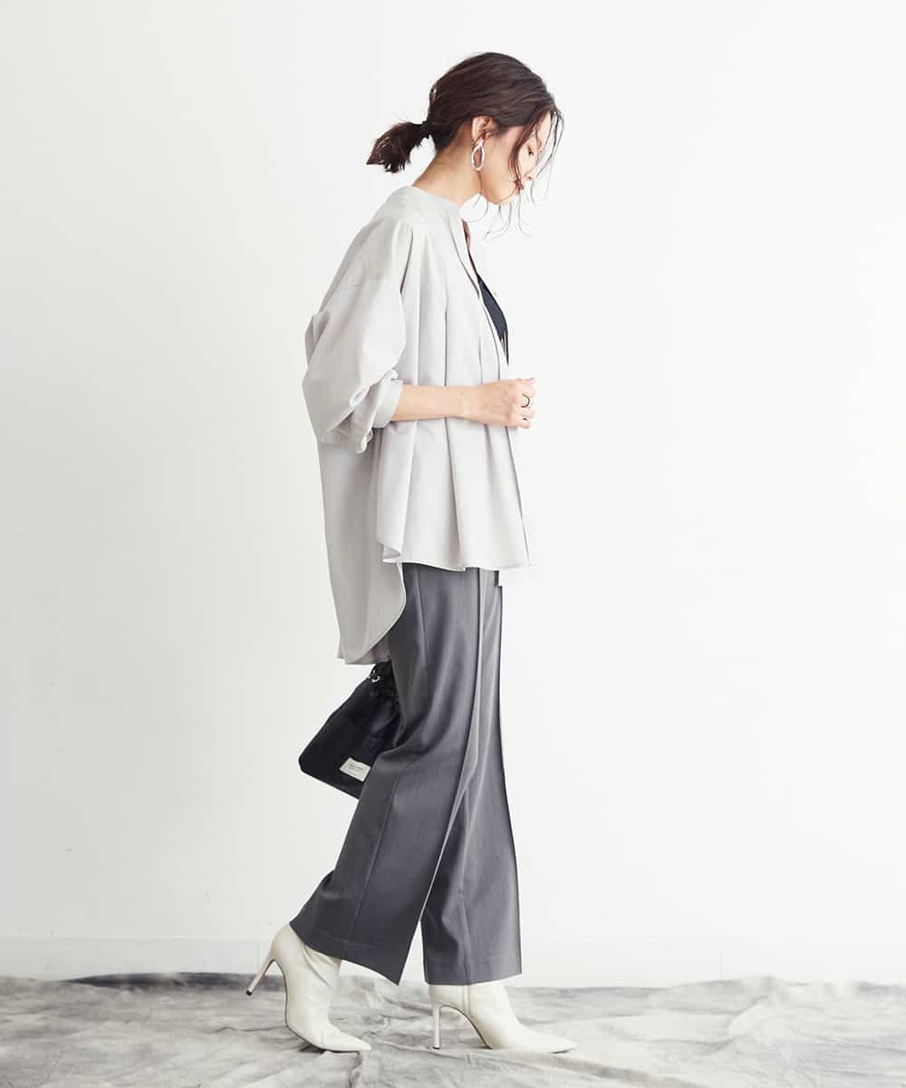 ビッグシルエットながら、着た時のシルエットがとてもきれいで、エレガンスなブラウスです。パンツと合わせたクールなスタイリングがおすすめです。(金沢エムザ)