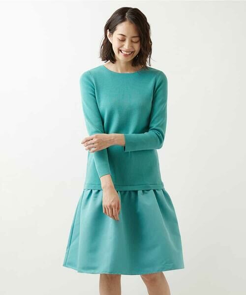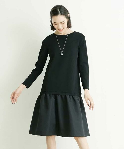 コンパクトで衿ぐりが詰まったなレトロな雰囲気のニットに、ローウエストで切り替えたグログランのスカートが華やかなワンピース。