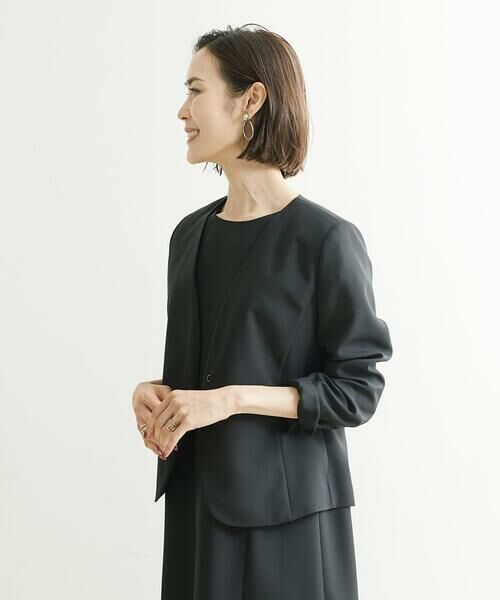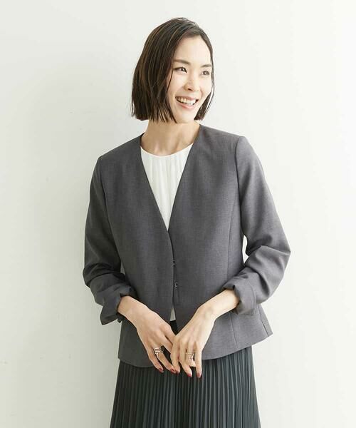 夏場のフォーマルなシーンでも活躍するジャケット。ノーカラーで首回りの熱を逃がしやすく、夏でも快適に着られるデザインです。40サイズは店舗限定展開です。