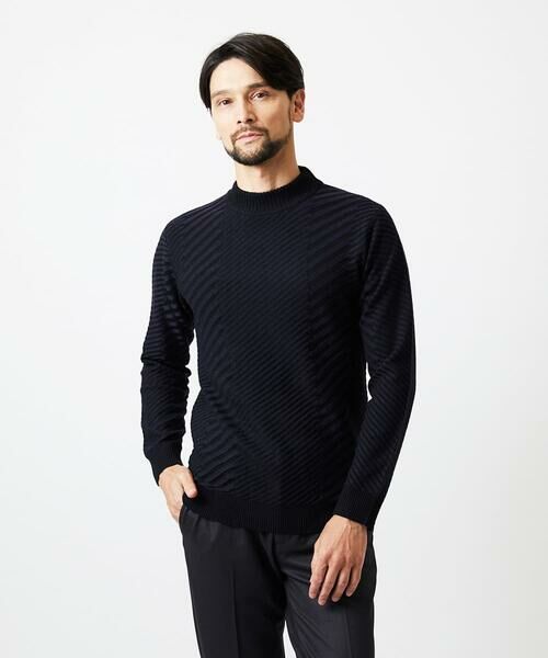 ・新たな試みとして、斜めに走るストライプ調の編地を採用し、さりげないアクセントが、装いに奥行きを与えます。