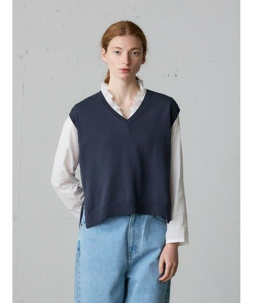 オーガニックコットンを使用したニットシリーズ、ハイローVネックベストです。ゆったりのサイズ感が特徴で、前後差を大きめにとり、シャツともワンピースとも合わせやすいベストに仕上げました。レイヤードアイテムとしてお勧めです。深いグリーンを取り入れた、秋の季節感を感じていただけいる1枚です。シリーズで3-729988/Vネックニットプルオーバー、3-729919/ポロニットカーディガンも展開。