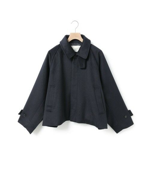 ウールポリエステルのフラノ素材を使用したウールショートジャケットです。フラノ素材ですが軽く仕上げたウールコート。丸みのあるコクーン型の袖と襟元のチンストラップがポイント。ショート丈でどんなボトムスとも相性良く着用していただけます。フロントはボタンを使用。比翼仕立てなので閉めるとすっきりとしたデザインになっています。ウールコートシリーズとして3-779928/ステンカラーミドルコートも展開。