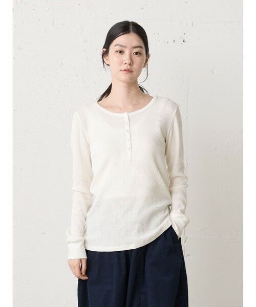 コットンウールのワッフル素材を使用したワッフルヘンリーネックプルオーバーです。凹凸の空気層をつくり保温性が保てる薄くて軽いワッフル素材です。襟ぐりを広めにしたヘンリーネックインナーで細身のシルエットが特徴。ヒップに掛かるほどの丈感でレイヤードアイテムとしてインナー使いに役立つ1枚。カジュアルベーシックなアイテムなので長く愛用できるのもポイントです。同シリーズ4-710034/ワッフルクルーネックプルオーバーも展開。
