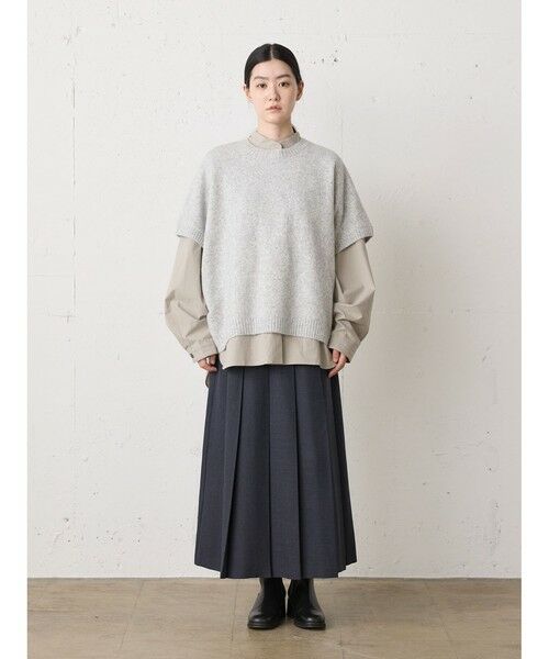 ウールツイード見えするポリエステル地を使用したプリーツスカートです。程よい厚みがあり、非常に落ち感のきれいな素材が特徴的。プリーツ幅太目の片ひだプリーツスカートを表現。長めの丈でウエストはリラックス感のあるゴム使用。ニットアイテムとも相性が良く、清楚で落着きのある女性らしい着こなしを演出します。MidiUmiで長く人気のお勧めの1枚です。