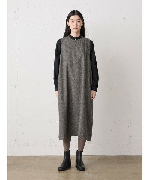 尾州地域で織り上げたウールツイード素材を使用したツイードノースリーブワンピースです。軽く、程よく柔らかく暖かい素材感が特徴的。「尾州」でつくられた織物の多くは、国内外のファッションブランドにおいて製品をつくるための生地として採用されているだけでなく、世界三大織物産地のひとつとも言われております。誰もが知る海外の有名ブランドも定番的人気を誇るクラシックといえるファッションアイテムにも、「尾州」 産の生地が使われているのは誇りのひとつです。 そのワケは、品質の高さにあり、軽さ・やわらかさ・なめらかさ・柄の豊富さ・丈夫さなど、触るだけで違いが分かるはずです。比較すれば尚の事、良くて当然、それを安定供給できるのが「尾州」の強みです。MidiUmiでは、ツイード特有のキレイさとカジュアルな雰囲気を生かしたデザインに仕上げました。バックスリットが深めなデザインなので着脱もしやすくなっています。アームも広めで中にニットなど着やすいのがポイント。トラッド感・ブリティッシュ感を演出できる1枚です。