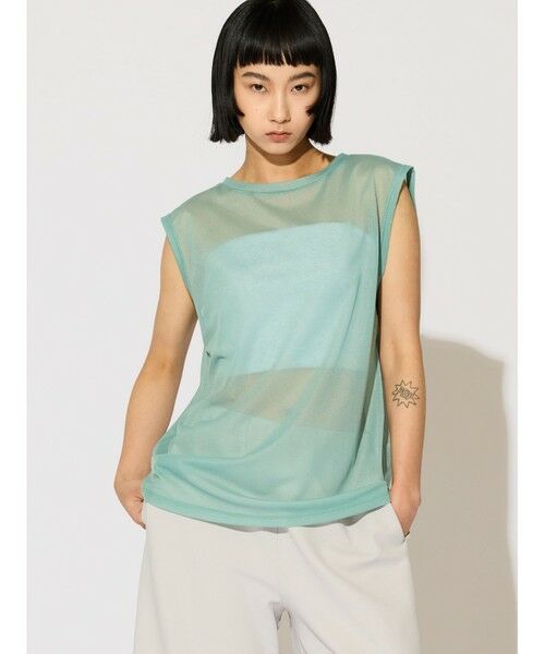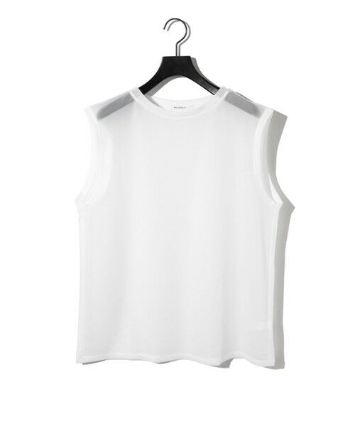 2-112136/シアーレイヤードTシャツと同じ素材を使用したシアーノースリーブプルオーバー。レイヤードアイテムとして今季風にコーディネートしていただけます。キャミソールを合わせたりと透け感を活かしたオシャレを楽しんでいただける1枚。アームが広く窮屈さは感じられません。シンプルなタンクトップのデザイン仕上げなのでベーシックに着こなせます。