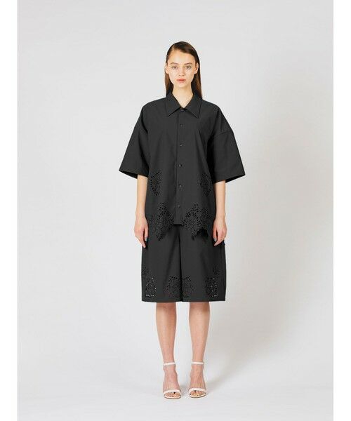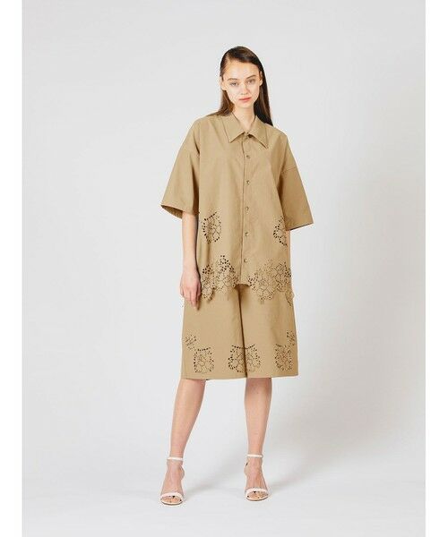 繊細なカットワークを施したカットワークデザインシャツです。刺繍の透け感とランダムにカットされた軽さと動きのあるデザインを演出しました。レギュラーカラーのゆったりとしたサイズ感でとても涼しく着ていただけるシャツです。コーディネートするアイテムによって色の表情がでるのも魅力的。同シリーズの1-165001(カットワークデザインショートパンツ)とセットアップにしても素敵です。