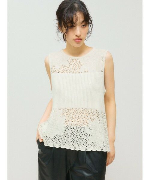 撚糸加工の綿糸でシャリ感のある7Gレース編みでデザインしたレースリブベストです。程よい肉感によるレース編みの立体感を活かして大きいモチーフと細かいメッシュ柄を組み合わせた印象的な1枚です。ブラトップのようなリブ切り替えとレース編みの組み合わせがポイントのシンプルなベストです。1枚でもレイヤードでもコーディネートを楽しんでいただけるサイズ感で同シリーズの3-122142/レースメッシュカーディガンと合わせるのも新鮮でおすすめです。