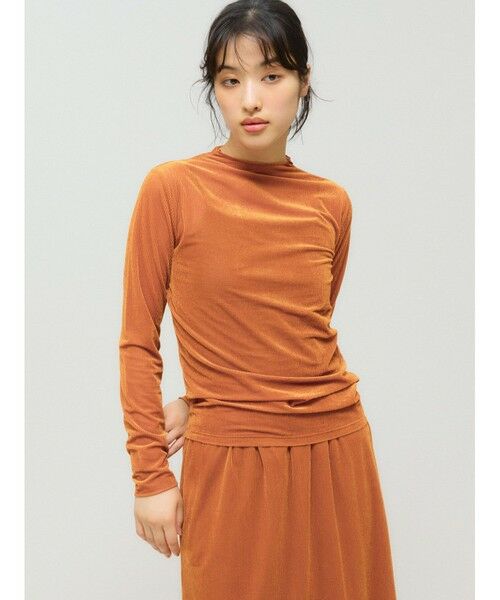 シアー素材を使用したシアーベロアリブトップスです。3-162192/シアーベロアリブスカートとのベロアシリーズでデザインしており、セットアップでオケージョン対応にもお勧めの1枚です。タイトなシルエットでインナー使いに重宝します。薄手の生地ですがベロア生地なので温かみがあります。差し色にオレンジを取り入れた華やかなカラーも魅力的。シンプルなデザインなのでベストを重ねたりとオシャレを楽しんでいただけるアイテムです。秋の立ち上がりに重宝していただけます。