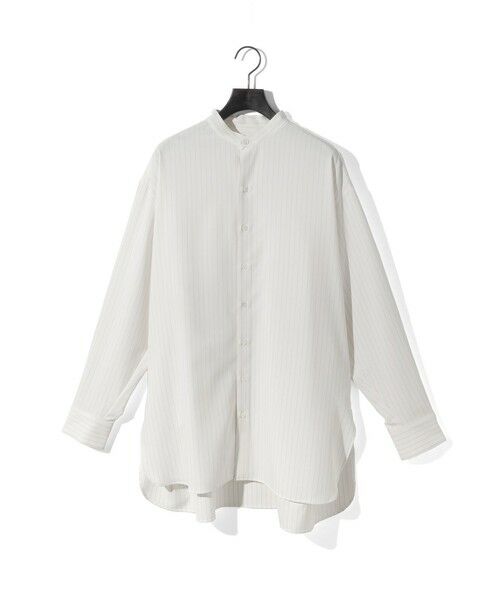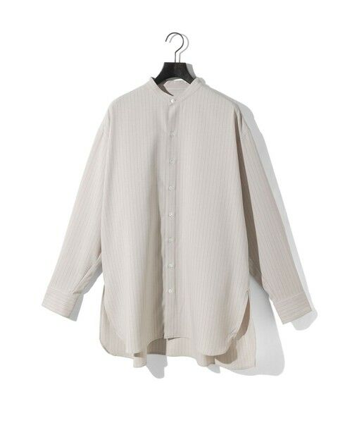 ユニセックスサイズのアイテムです。身長152cmで膝上5cmほどの丈感、ゆったりとしたビッグシルエットで着用できます。すっきりとしたバンドカラーと優しいカラーリングで、着ぶくれ感なく軽やかな印象で着用できます。シボ感のある上品な素材で、前後差のあるラウンドヘムが動きをプラス。ベストを重ねたスタイルも映えます。サイドポケット付きで、軽いアウター感覚でも着られるのがうれしいポイント。ドライタッチな素材感で、季節を問わずレイヤードスタイルに活躍しそうです。