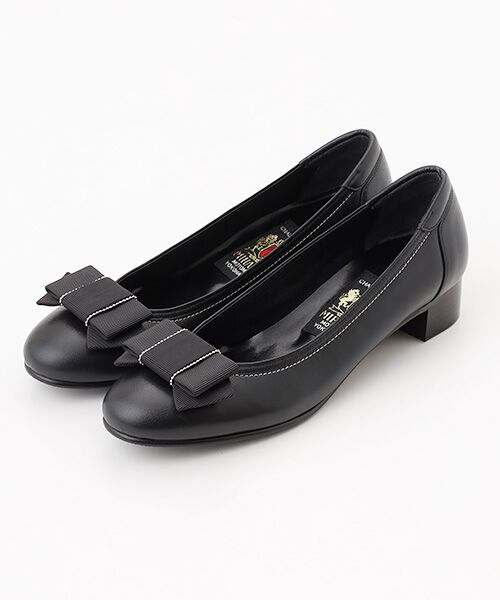 ミハマならではのオーソドックスなリボン付きローヒールパンプスです。グログランリボンのシルバーの縁取りがさり気なくエレガントな印象に。