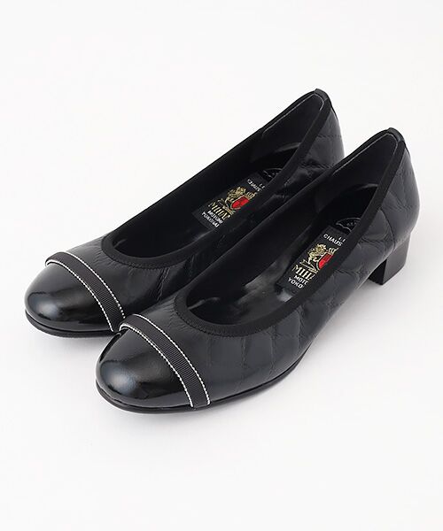 キルティング調の型押しとエナメルの切り替えが特徴的なデザインに、シルバーで縁取られたグログランテープが主張しすぎないアクセント。