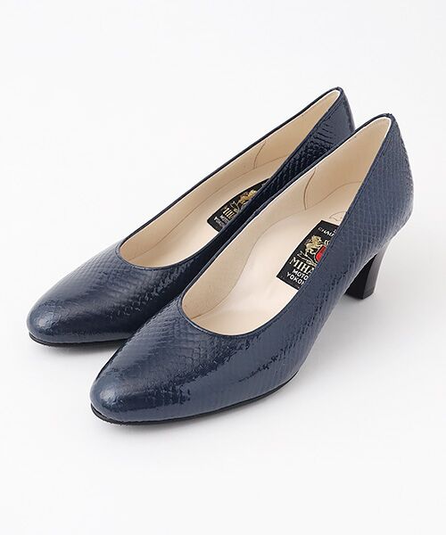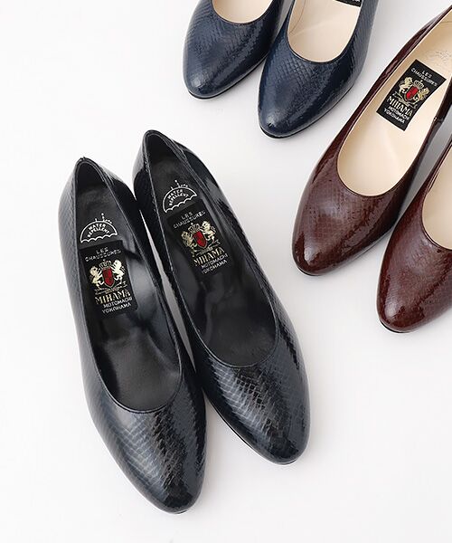 エレガントなヘビ柄型押のエナメルパンプスです。