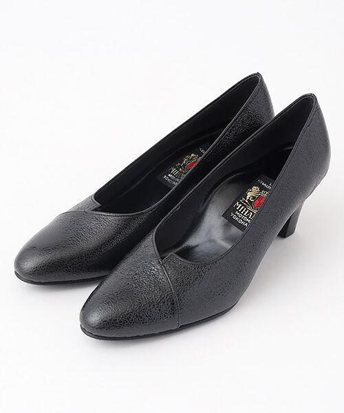 マットな質感のブラックレザーにさり気ない切替デザインで、足元をすっきりキレイに見せてくれる6cmヒールパンプス。