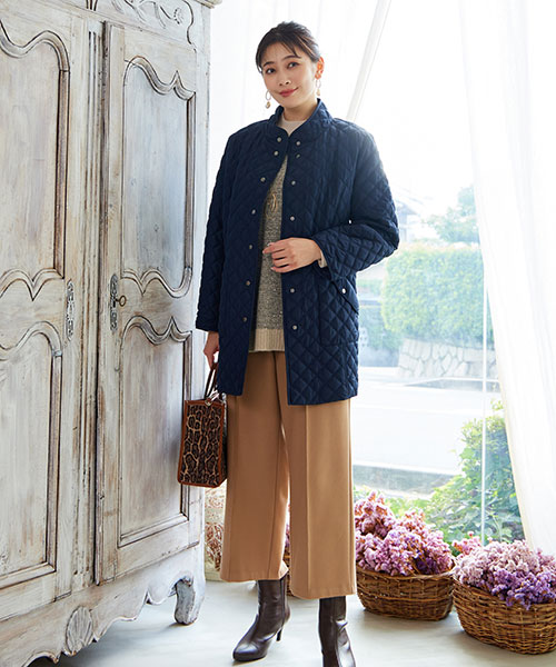 【大きいサイズ/L~3Lサイズ】人気のキルトコートに煌めき感のあるセーターを合わせて華やかにコーディネート