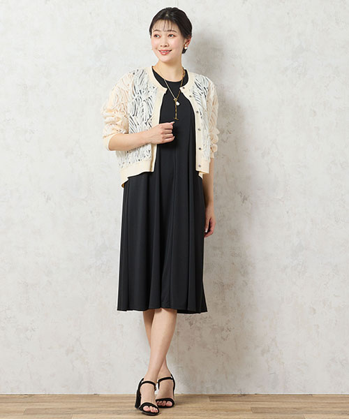 【大きいサイズ】テープ刺繍の華やぎカーディガンがエレガンスシーンにピッタリ!ワンピースとフェミニンな着こなしがおすすめです。