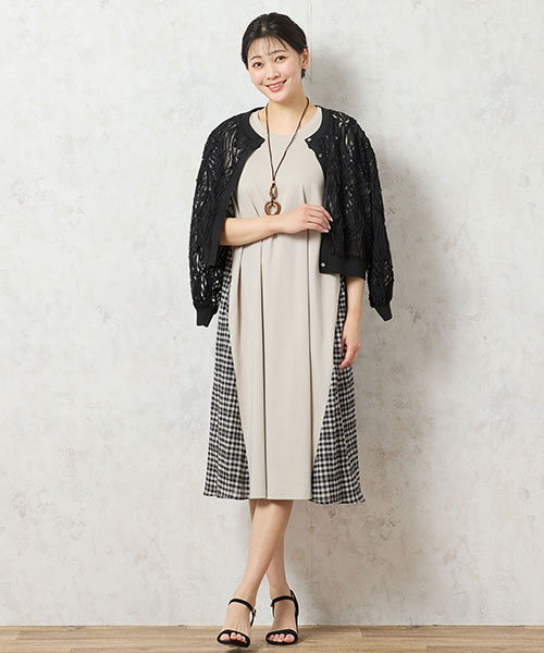 【大きいサイズ】ギンガムチェックが可愛いワンピースに、シアー感が涼し気なカーディガンを合わせました。モノトーンで大人フェミニンな印象に!