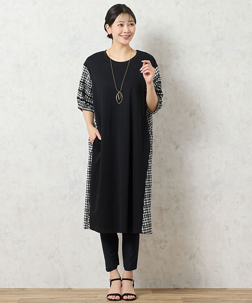 前身はドライな質感のコットンジャージー素材、袖や後ろは柔らかいギンガムチェックを使用したデザイン。