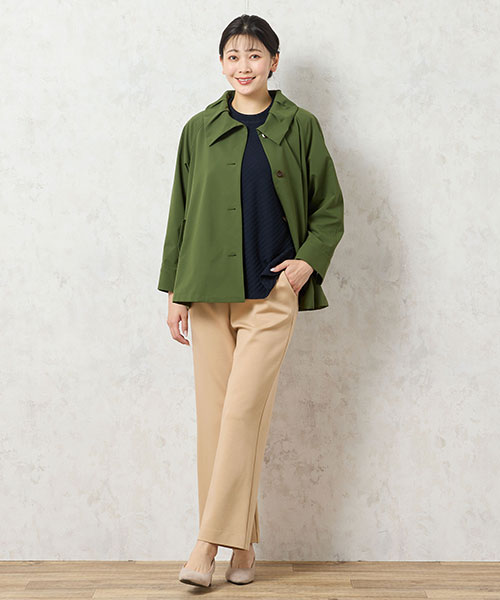 【大きいサイズ】深みのあるグリーンのジャケットはベージュのパンツと相性抜群。カジュアルにも綺麗目にも楽しめる優秀アウターです。